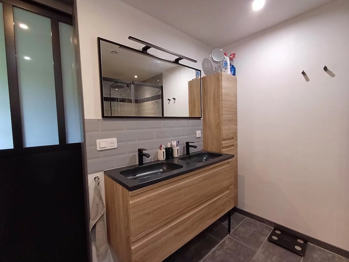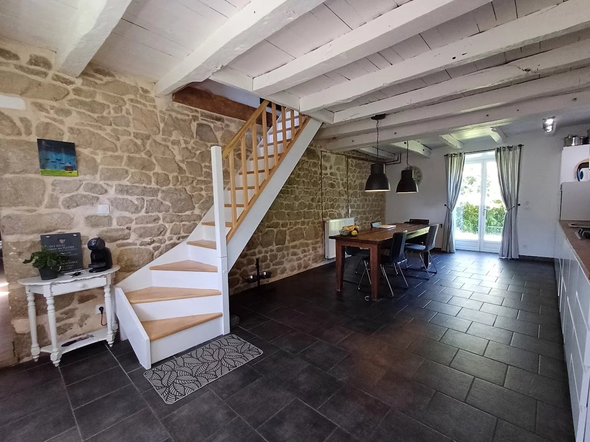 You enter through the large, fully equipped kitchen/diner (31m²) with French doors to the back garden. Here you also find the access to the cellar. There is a spacious, bright living room (30m²) with an adjoining room where the old bread oven and an original well are located. Through a cloakroom, which provides access to a separate toilet, you enter the first bathroom (shower and washbasin) with the laundry room behind it, which houses the washing machine, dryer and gas-fired central heating boiler.