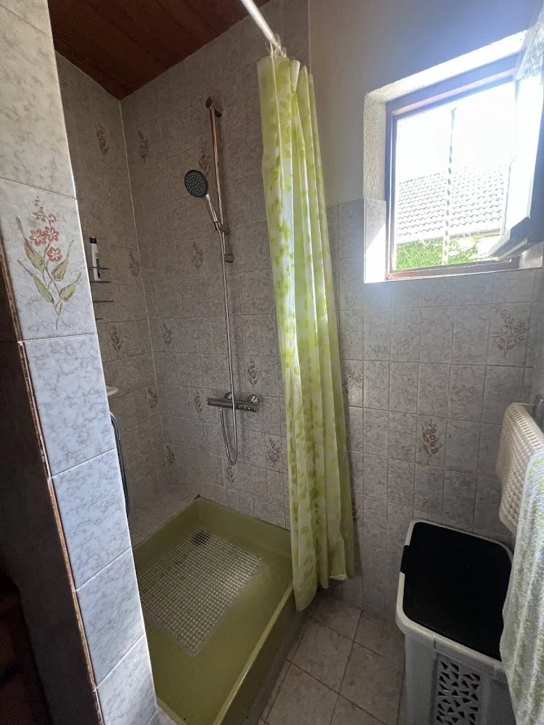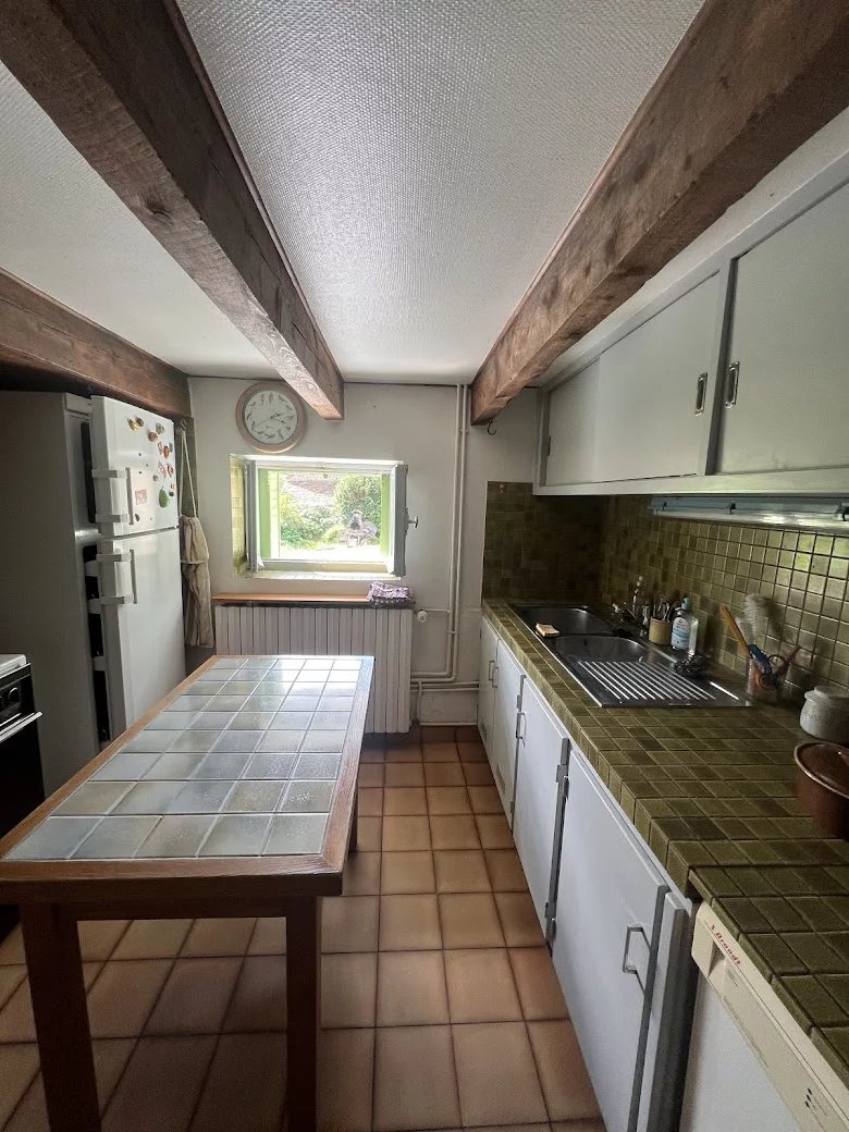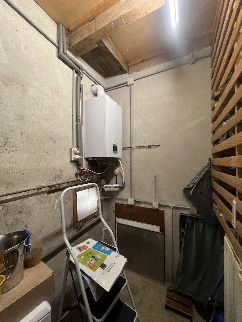 The house has a living room of approximately 30 m² with a fireplace and an office space, a toilet and a bathroom with shower on the ground floor. A few steps lead to the kitchen (7.5 m² and only 1.70 m high) and underneath it a cellar with, among other things, the central heating boiler.
