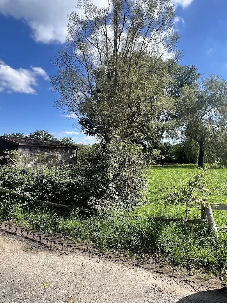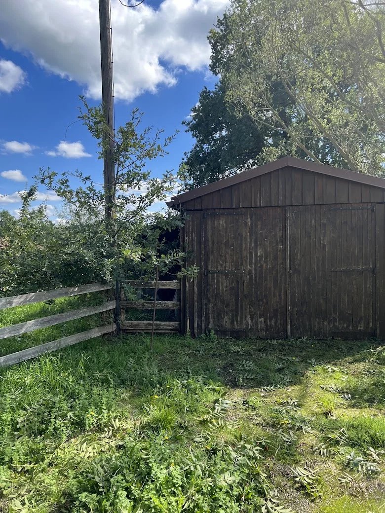 In front of the house is a paved courtyard with a barn on the other side, which has space for a garage, a workshop and storage.