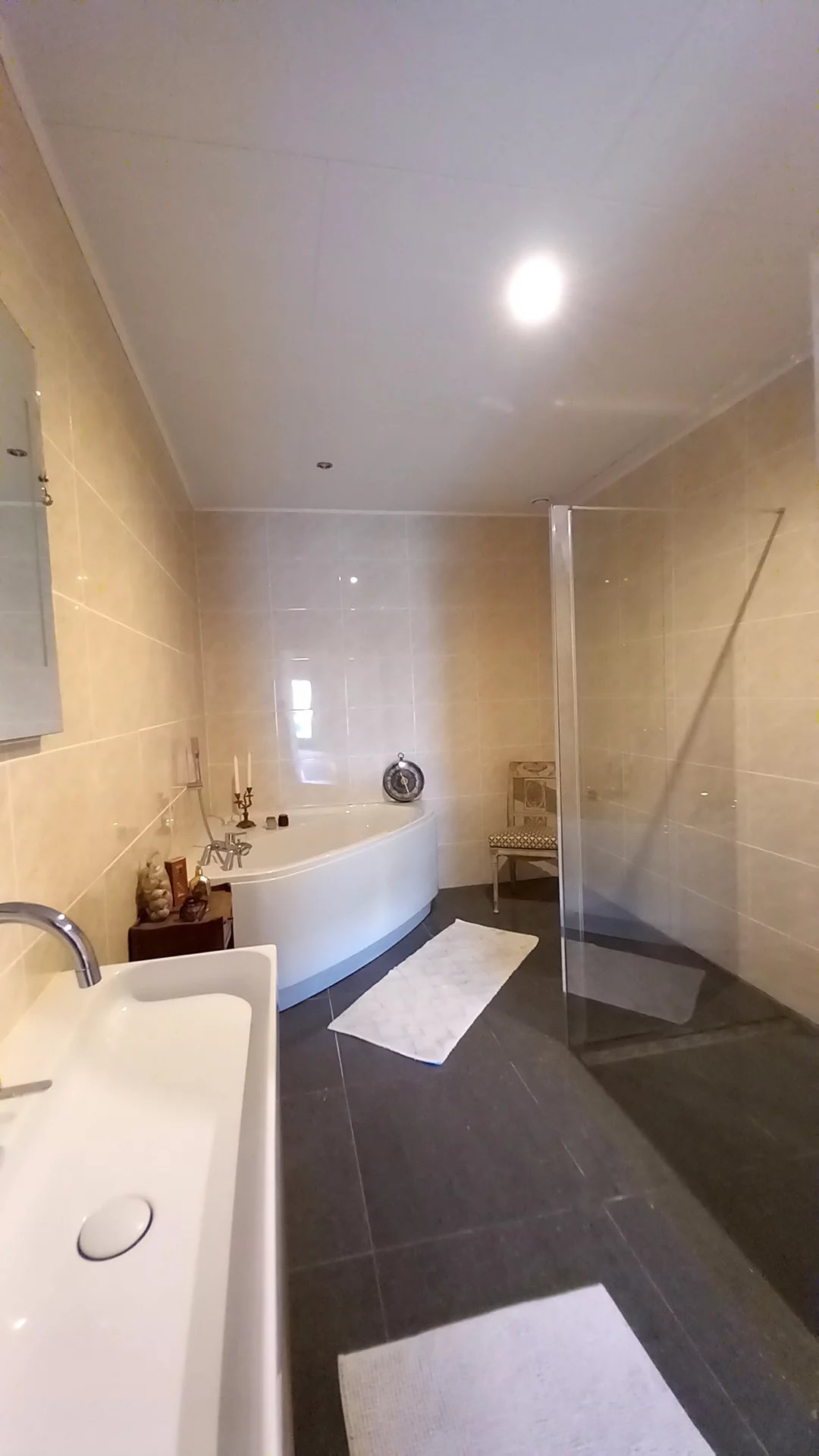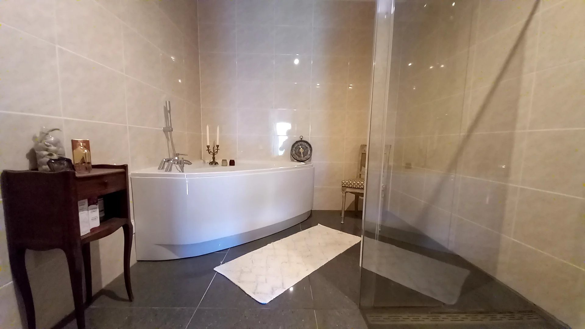 • Une salle de bains luxueuse (11,6 m²) avec baignoire, douche à l’italienne, meuble vasque et WC suspendu