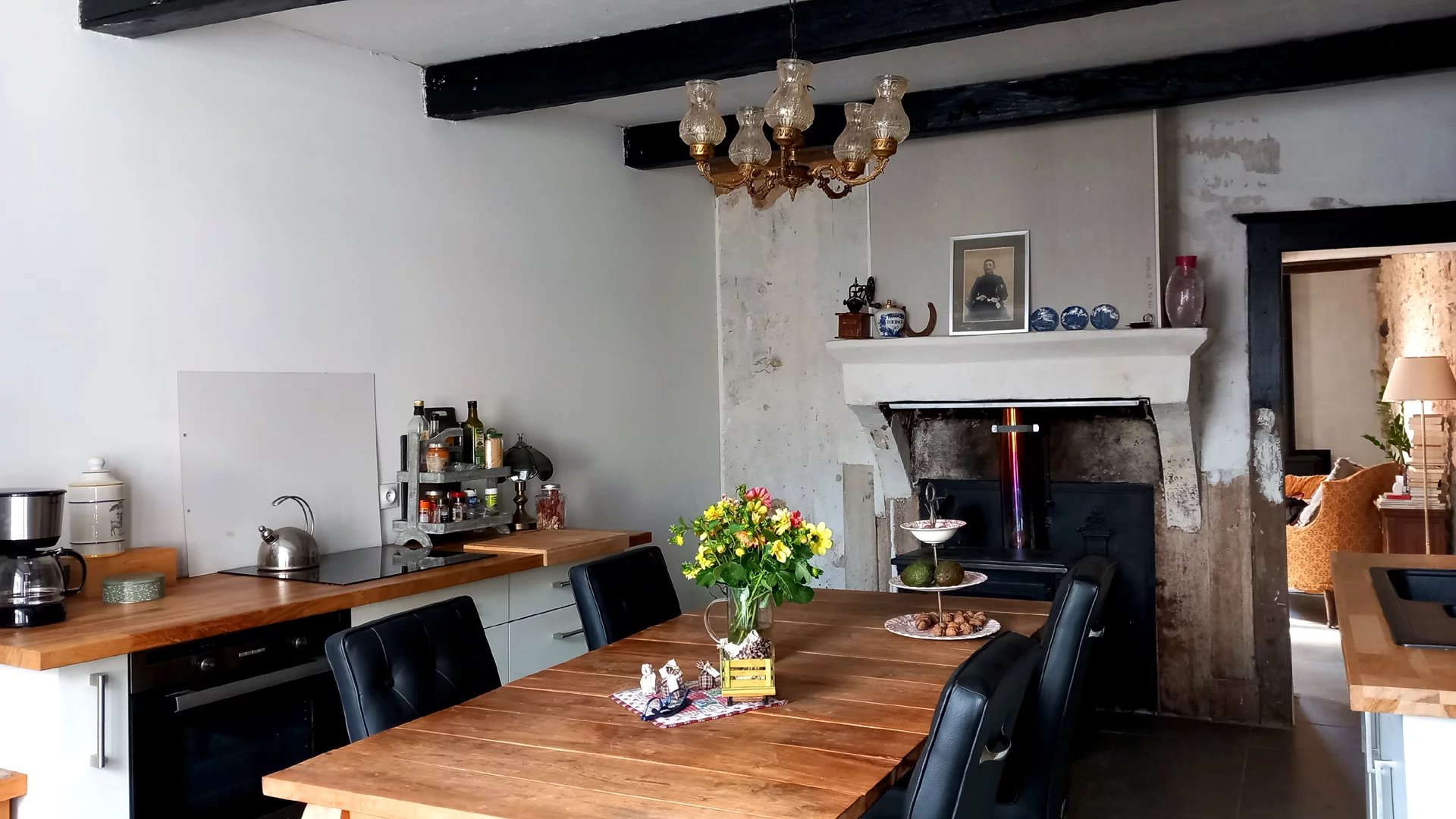 La maison principale dispose d’une spacieuse cuisine aménagée (19 m²) avec cheminée et poêle à bois, d’un séjour lumineux (29 m²) avec portes-fenêtres donnant sur la terrasse. Le garage attenant (32,4 m²) offre beaucoup de rangement et est équipé d’une arrivée pour machine à laver. La porte d’entrée et les portes de garage ont été récemment remplacées.
